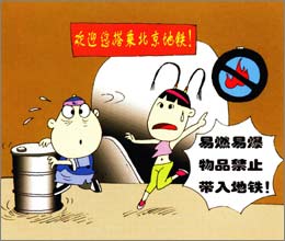 | 10、嚴(yán)禁攜帶雷管、炸藥、鞭炮、汽油、柴油、煤油、油漆、電石、液化氣、酸類等易爆、易燃、有毒、腐蝕性和殺傷性等危險品以及容易污染地鐵設(shè)備和站、車環(huán)境的物品乘車。 |