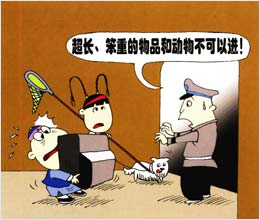 | 3、禁止攜帶超長(1.8米以上)、笨重(如自行車、洗衣機、電視機、臺式電腦顯示器、電冰箱、組合音響等)、動物以及妨礙公共衛(wèi)生、車內(nèi)通行和危害乘客安全(如玻璃及易碎玻璃制品)等物品乘車。禁止在地鐵站內(nèi)、車內(nèi)吸煙、隨地吐痰、亂扔廢棄物,保持站、車衛(wèi)生。 |