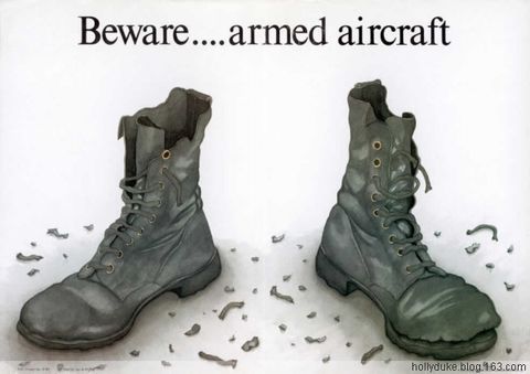 圖04 一雙靴子兀自立在地上,周?chē)教幧⒙渲槠???戳松厦娴奈淖?,誰(shuí)都會(huì)明白這幅畫(huà)的含義——小心,飛機(jī)攜帶了武器!這是在提醒地勤人員在處理已經(jīng)攜帶武器的作戰(zhàn)飛機(jī)時(shí)候,務(wù)必萬(wàn)分小心,否則,一聲爆炸,地面上能留下雙靴子就很不錯(cuò)了。