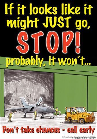 圖14 一架“狂風(fēng)”正離開(kāi)機(jī)庫(kù),地勤人員大叫“停”,然為時(shí)已晚,翅膀撞上了大門(mén)!漫畫(huà)上的文字是:如果有些事看起來(lái)行得通,那么就停下來(lái),因?yàn)槟菢雍芸赡苄胁煌ā?/p>