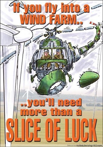 圖13 被切成一片片的軍用直升機(jī)!發(fā)生了什么事情?看看上面的文字:如果您飛進(jìn)了風(fēng)力發(fā)電廠,那么您可能就需要多“一小片”運(yùn)氣了。原來(lái)這是在提醒飛行員不要進(jìn)入對(duì)安全飛行存在威脅的地區(qū)。