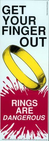 圖10 漂亮的戒指很可能是索命的魔鬼。這張漫畫(huà)上部的大字是,“把你的手指從戒指中拔出來(lái)”,下面的文字則是,“戒指是危險(xiǎn)的東西”。這是給地勤人員的安全警示,由于可能需要維修一些運(yùn)轉(zhuǎn)的機(jī)件,佩戴戒指很有可能讓機(jī)件鉤掛住他們的手,造成意外傷害。