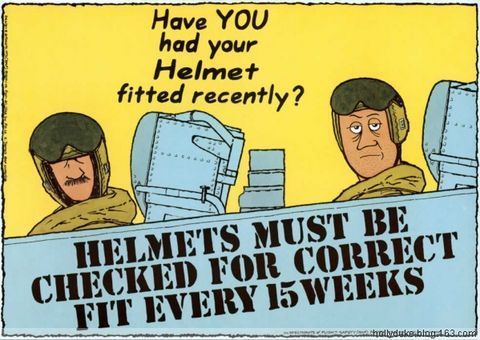 圖08 兩名神態(tài)木訥的飛行員。前面那位頭盔已經(jīng)蒙住了雙眼,后座那位頭盔卻還在腦門(mén)頂上。漫畫(huà)上的文字提醒飛行員,你的頭盔尺寸最近檢查過(guò)了么?而飛機(jī)座艙上的文字則更是明確,“飛行頭盔每隔15周必須檢查尺寸是否合適”。(由于人的頭部尺寸可能發(fā)生變化,飛行頭盔應(yīng)定期檢查,以確保正確佩戴)