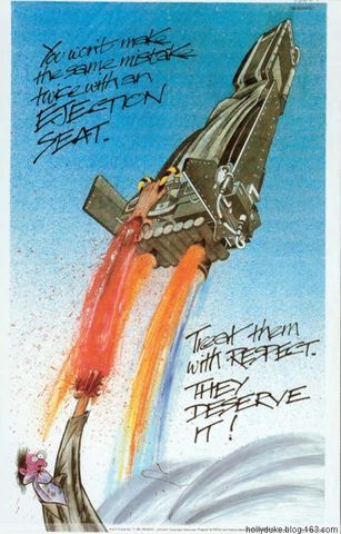 圖16 這幅漫畫(huà)是在提醒地勤人員維護(hù)飛機(jī)時(shí)注意不要意外啟動(dòng)彈射座椅。上面的文字是:對(duì)于彈射座椅,你只能犯一次錯(cuò)誤,不會(huì)有下一次。認(rèn)真對(duì)待彈射座椅,那樣做是值得的。
