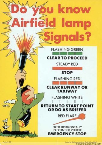 圖23 這是提請(qǐng)飛行人員注意熟記機(jī)場(chǎng)燈火信號(hào)的漫畫(huà),其中對(duì)幾種主要的燈火信號(hào)進(jìn)行了說(shuō)明。
