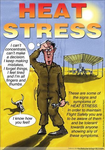 圖20 這是提醒炎熱天氣條件下作業(yè)的飛行和地勤人員注意高溫緊迫癥的漫畫(huà),它告訴人們,如果發(fā)現(xiàn)自己不能集中精力、不能準(zhǔn)確判斷、總是健忘疲勞并且常常笨手笨腳,那么他就有可能是高溫緊迫癥的受害者。
