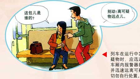 | 列車在運行中發現可疑物時,應迅速利用車廂內報警器報警,并迅速遠離可疑物,切勿自行處理。 | |