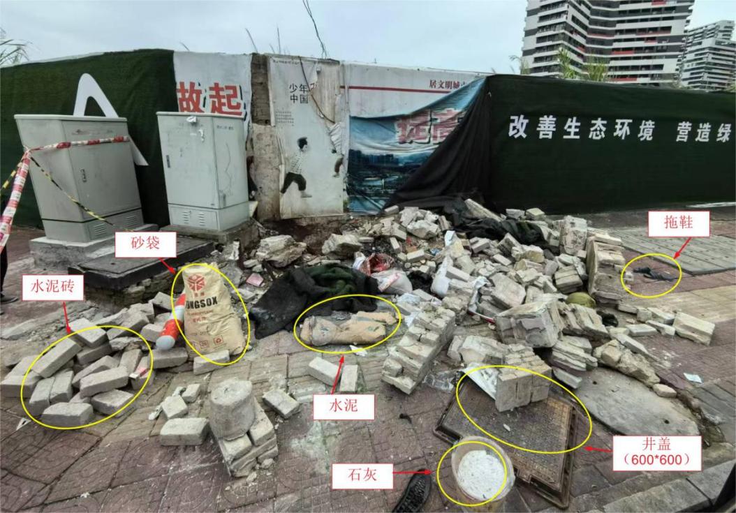 除墻體倒塌后散落的磚塊外,事故現場還有:一堆新的水泥磚(未使用過)、一袋砂、一袋水泥、一桶石灰、一個鑄鐵井蓋(600mm×600mm)、一雙拖鞋。見附圖5。