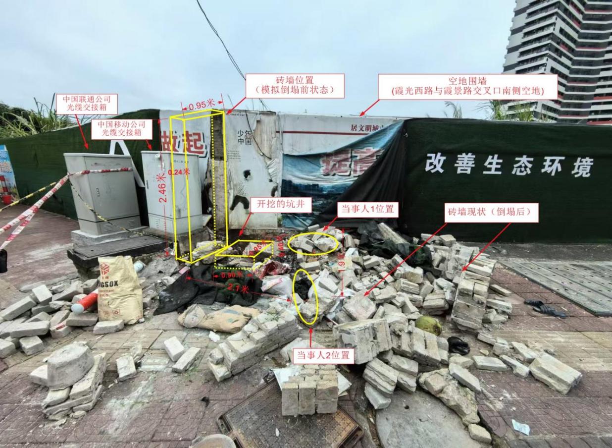 此次事故中倒塌的墻體為一段呈長方體的磚墻,該磚墻倒塌前位置:其南側緊貼南側空地圍墻,北側、西側為霞光西路,東側(背面)緊臨中國移動公司光纜交接箱(箱體側面標有“霞光二路光交”字樣,箱體長0.75米、寬0.55米、高1.37米),中國移動公司光纜交接箱旁邊有一個中國聯通公司的同類型箱體(箱體長0.75米、寬0.58米、高1.43米)。見附圖3。