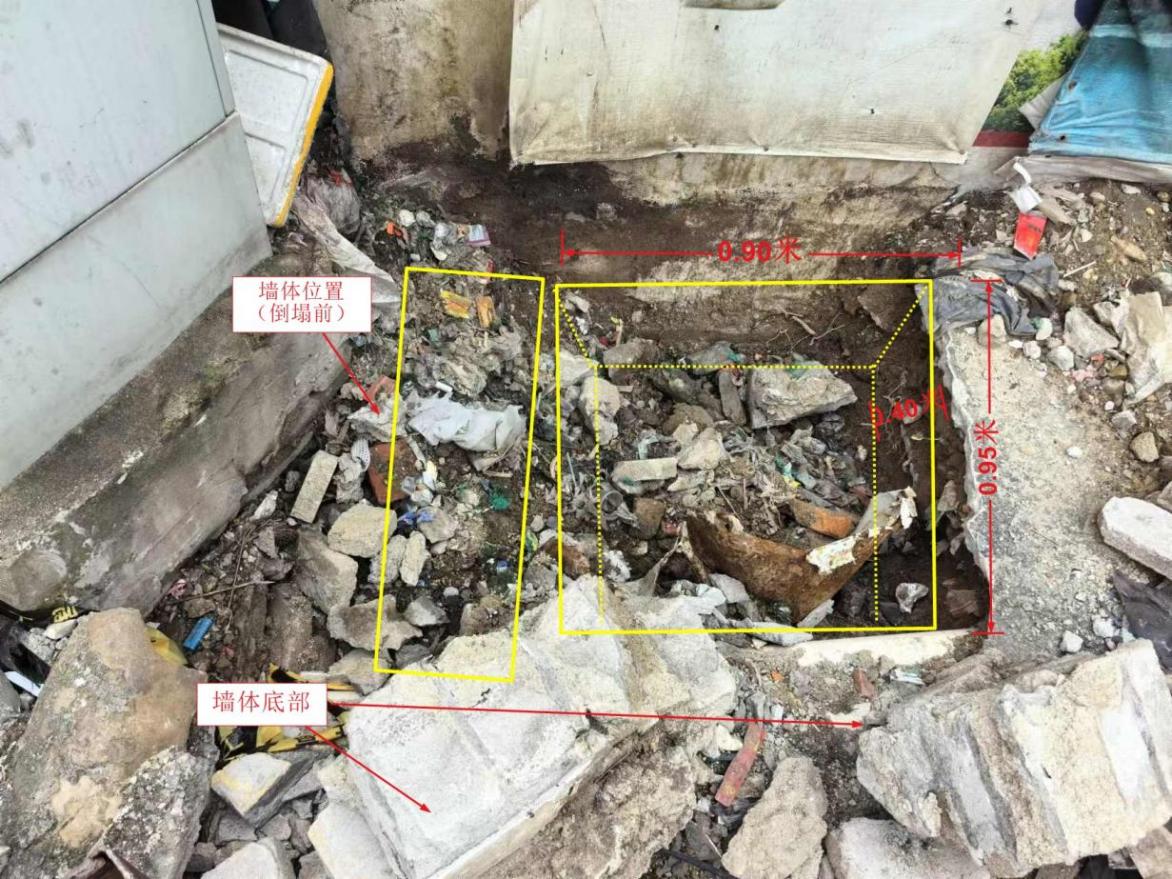 倒塌磚墻與空地圍墻交接處有已開挖的一個坑井,坑井東側緊貼倒塌磚墻墻腳,南側緊貼空地圍墻墻腳,位于水泥鋪裝面上、北側臨近人行道地磚,其尺寸長約0.95米、寬約0.90米、深約0.40米。見附圖3和附圖4。