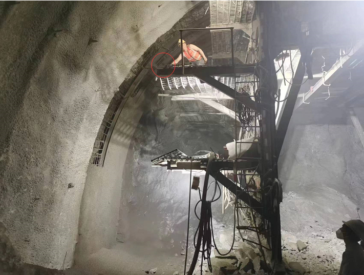 事故發生在禮約隧道進口端右洞,位于雅安市石棉縣王崗坪鄉挖角村2組。該隧道為在建隧道,曲墻式結構,隧道高7.15m,寬11.06m。事發時右洞掌子面樁號K78+040,開累進尺1371.6m。現場有一支護臺架,臺架高6m,寬10m,分三層,第一層距地面高1.6m,第二層距地面高3.2m,第三層距地面高5.2m。(附現場照片)