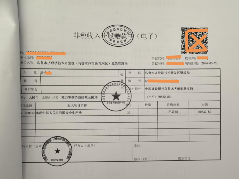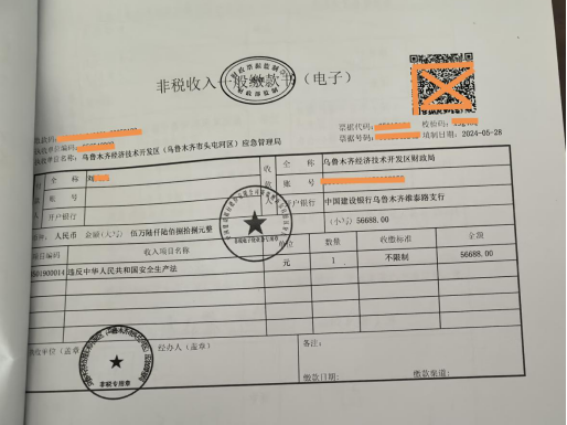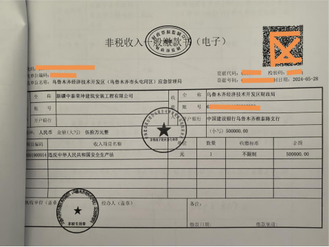 1.新疆中泰榮坤建筑安裝工程有限公司,區(qū)應(yīng)急管理局已經(jīng)對新疆中泰榮坤建筑安裝工程有限公司處以50萬元罰款的行政處罰。新疆中泰榮坤建筑安裝工程有限公司已繳納罰款。