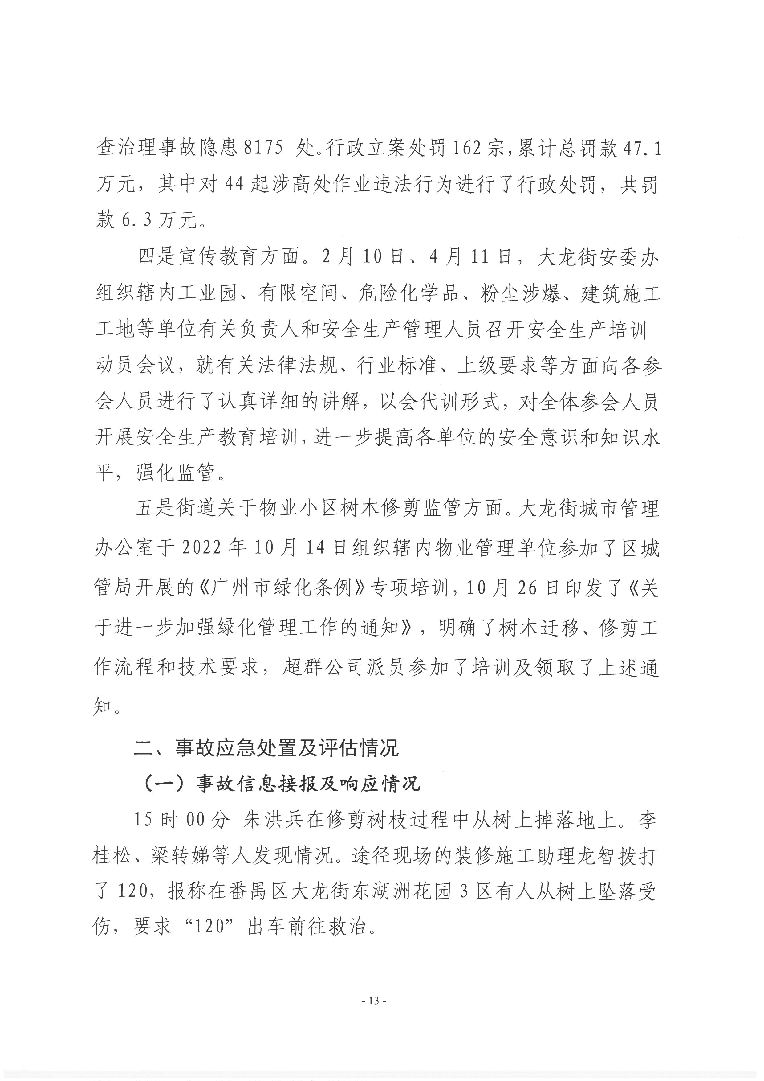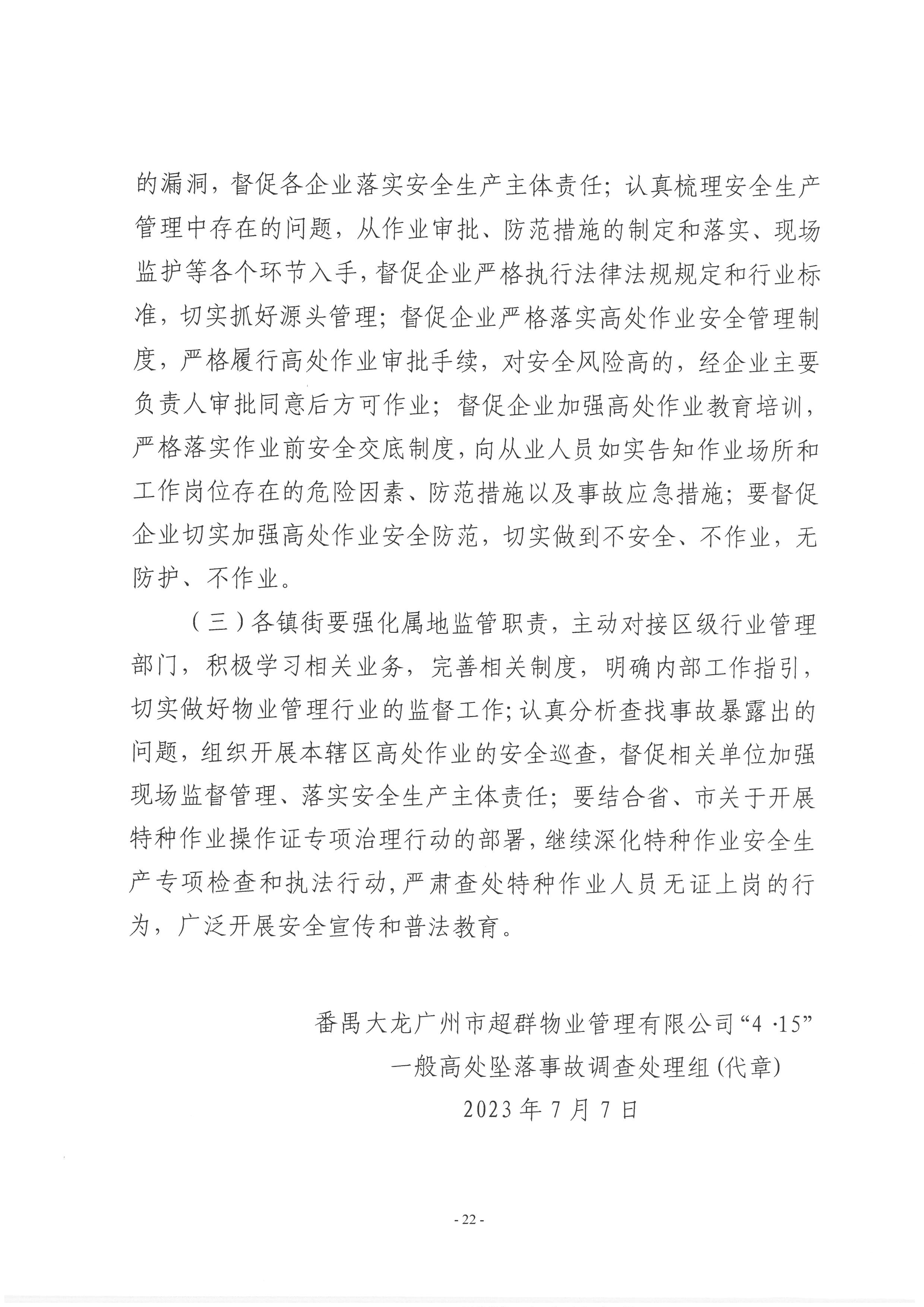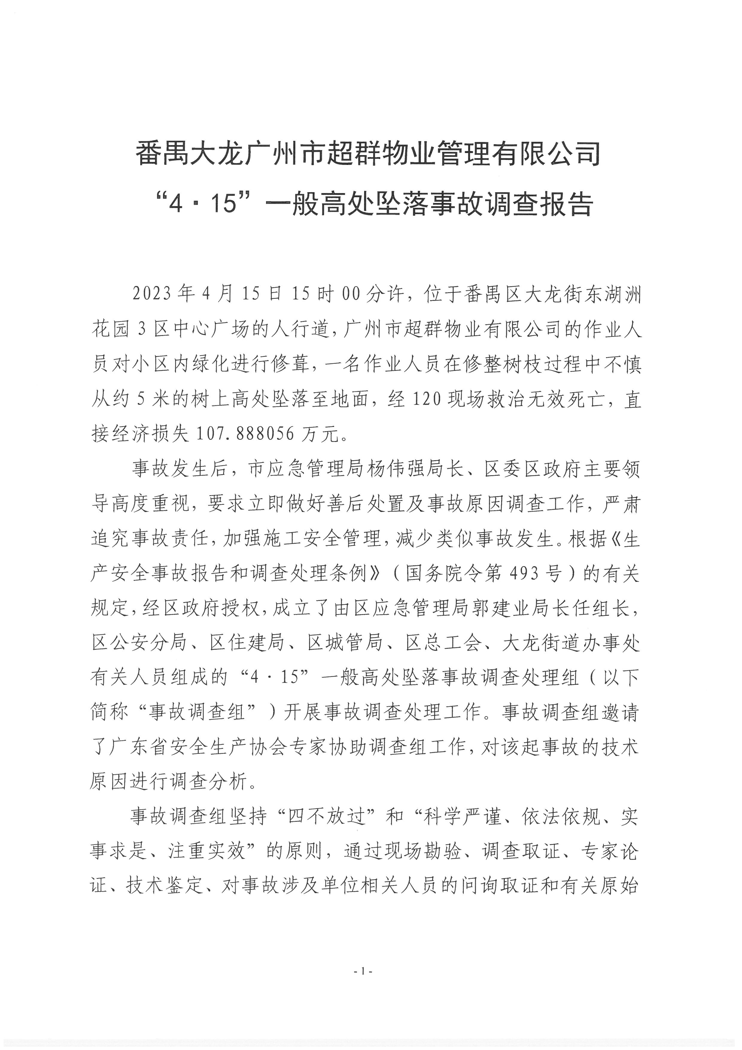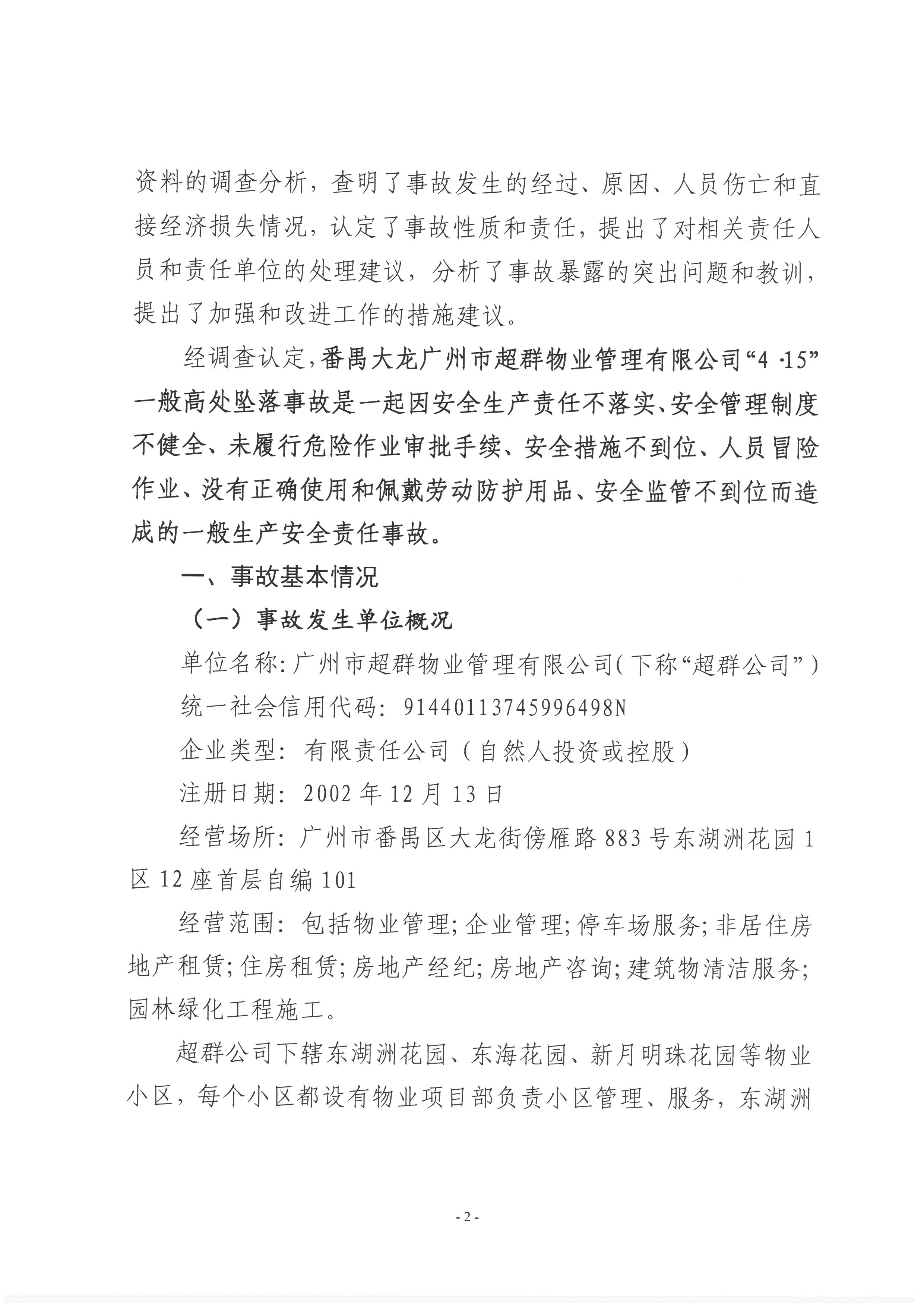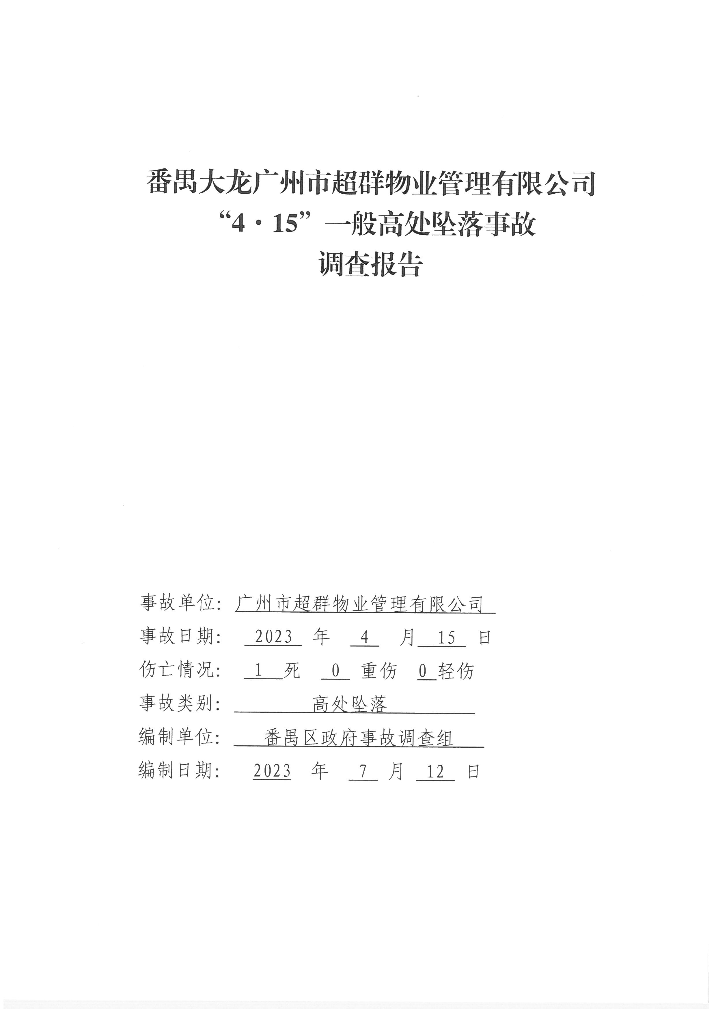 番禺大龍廣州市超群物業(yè)管理“4·15”一般高處墜落事故調(diào)查報告