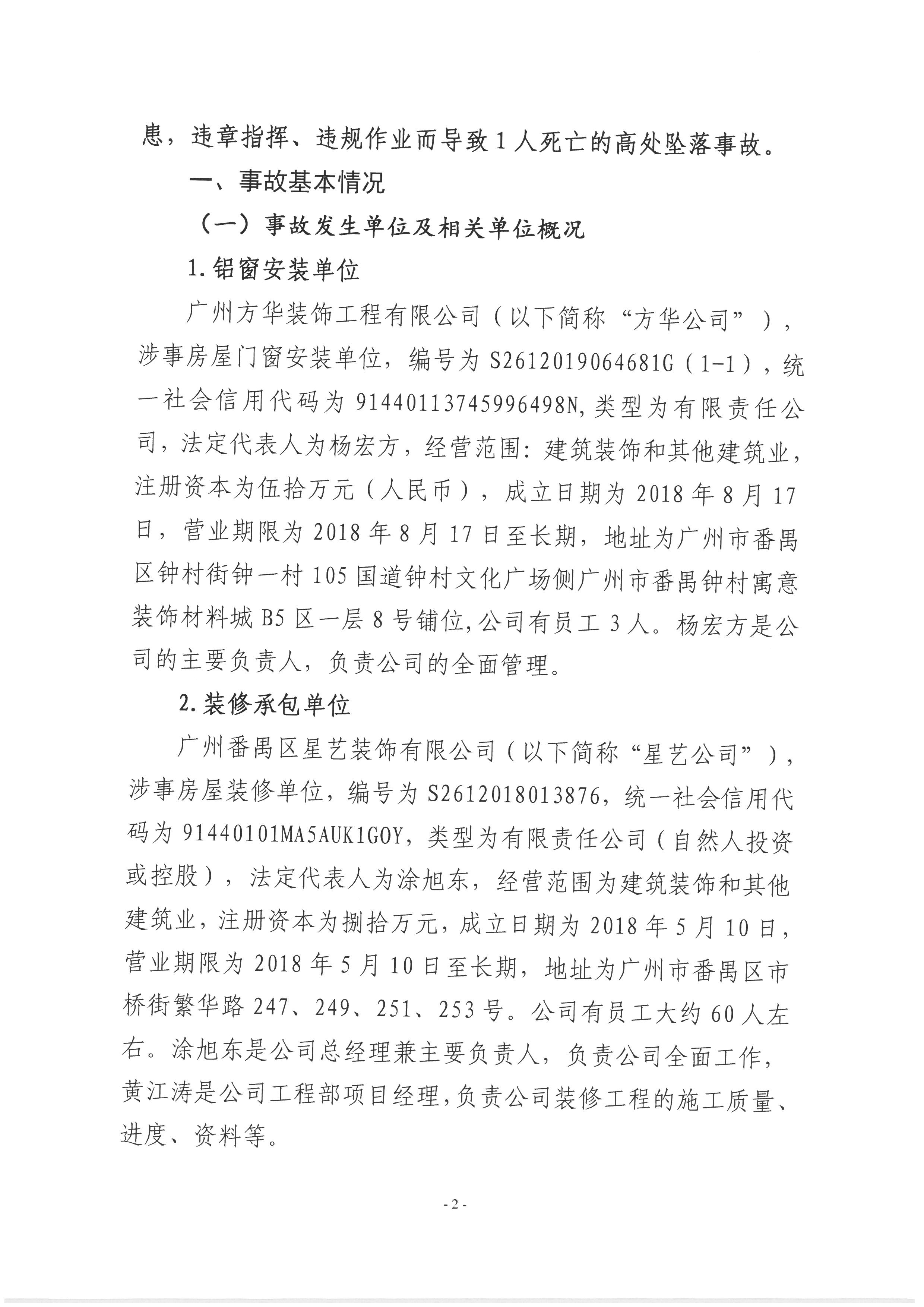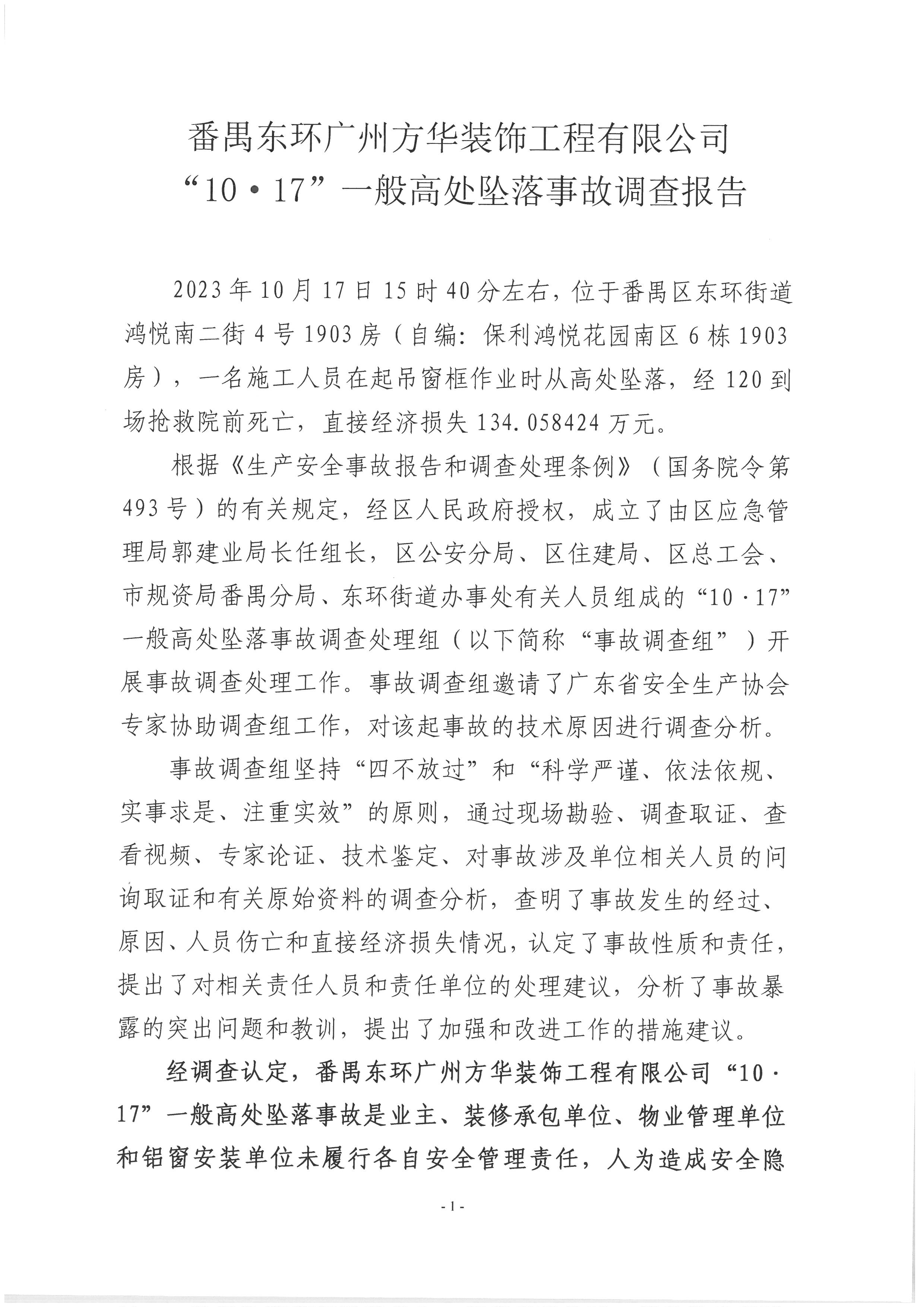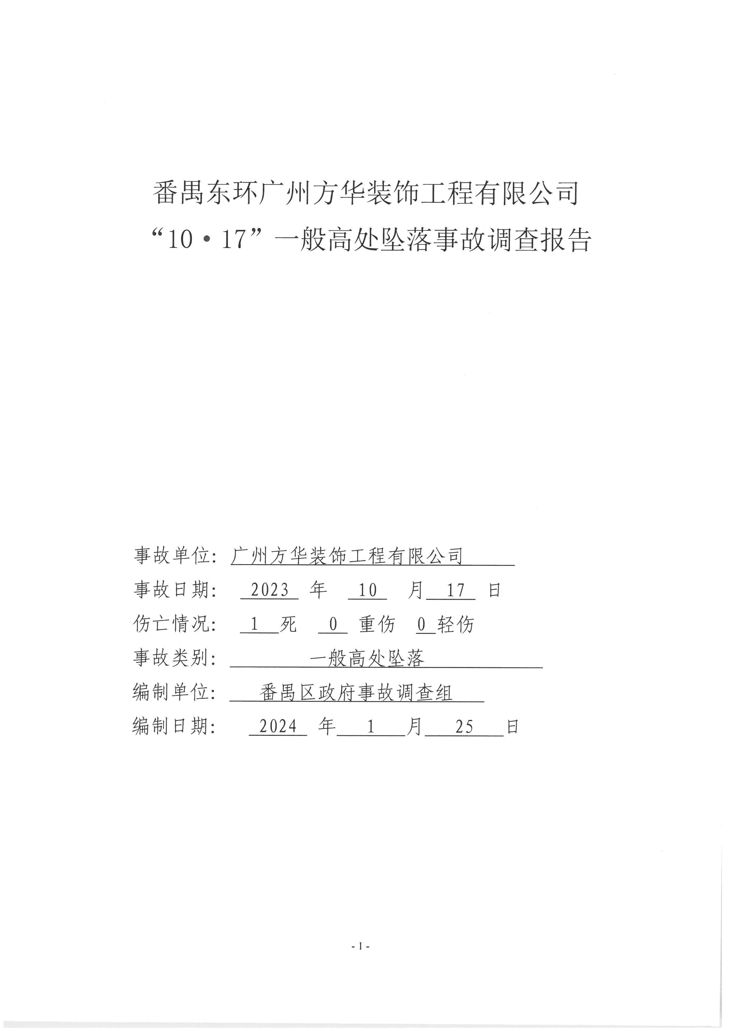 番禺東環(huán)廣州方華裝飾工程有限公司“10·17”一般高處墜落事故調(diào)查報告