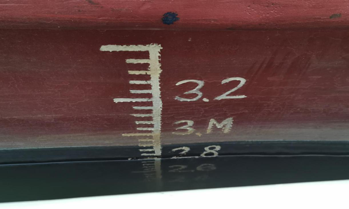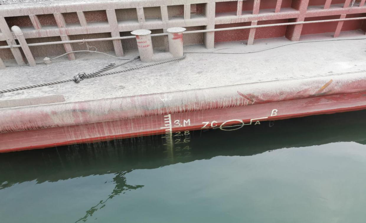 事發(fā)時,“桂平順舟***”船裝載石灰石約1100噸,船艏吃水3.00米,船舯2.95米,船艉2.80米,船舶裝載平衡。(詳見圖2、圖3、圖4)