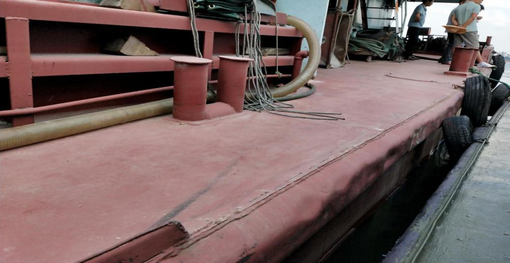 4.船艉主甲板舷邊安全防護(hù)不足,人員落水處無舷墻或者欄桿,不滿足《鋼質(zhì)內(nèi)河船舶建造規(guī)范(2009)》要求。《鋼質(zhì)內(nèi)河船舶建造規(guī)范(2009)》第一篇/第2章2.17.1.1要求:“自航船在每層甲板兩舷均應(yīng)設(shè)置舷墻或欄桿;……”,第一篇/第2章2.17.2.1有關(guān)免除條款適用情況“舷墻高度應(yīng)不小于0.55m,船長小于或者等于30m時,舷墻高度可以降低但應(yīng)不小于0.35m。如果舷邊過道太窄設(shè)置舷墻有困難時,應(yīng)在甲板上設(shè)置防滑設(shè)施,且甲板室外壁應(yīng)裝設(shè)扶手。”