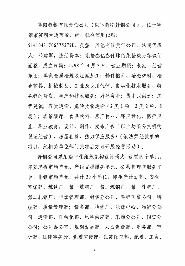 舞陽鋼鐵有限責任公司(以下簡稱舞鋼公司),位于舞鋼市濱湖大道西段,統一社會信用代碼:91410481706575279U,類型:其他有限責任公司,法定代表人:鄧建軍,注冊資本:貳拾叁億叁仟肆佰柒拾柒萬零玖佰圓整,成立日期:1998年4月2日,營業期限:長期,經營范圍:黑色金屬冶煉及壓延加工;鑄件鍛件、冶金爐料、冶金輔具、機械制品、工業及民用氣體、自動化技術服務、特殊鋼的研發、生產和技術服務;對外貿易;集中式供水;工程建筑;客貨運輸、危險貨物運輸(2類1項、2類2項、8類);賓館餐廳、食品飲料、房產物業、環衛綠化、醫療衛生、職業教育。設計、制作、發布廣告(以上均限分支機構憑證經營)、房屋租賃、熱力供應服務*(依法須經批準的項目,經相關單位部門批準后方可開展經營活動)。