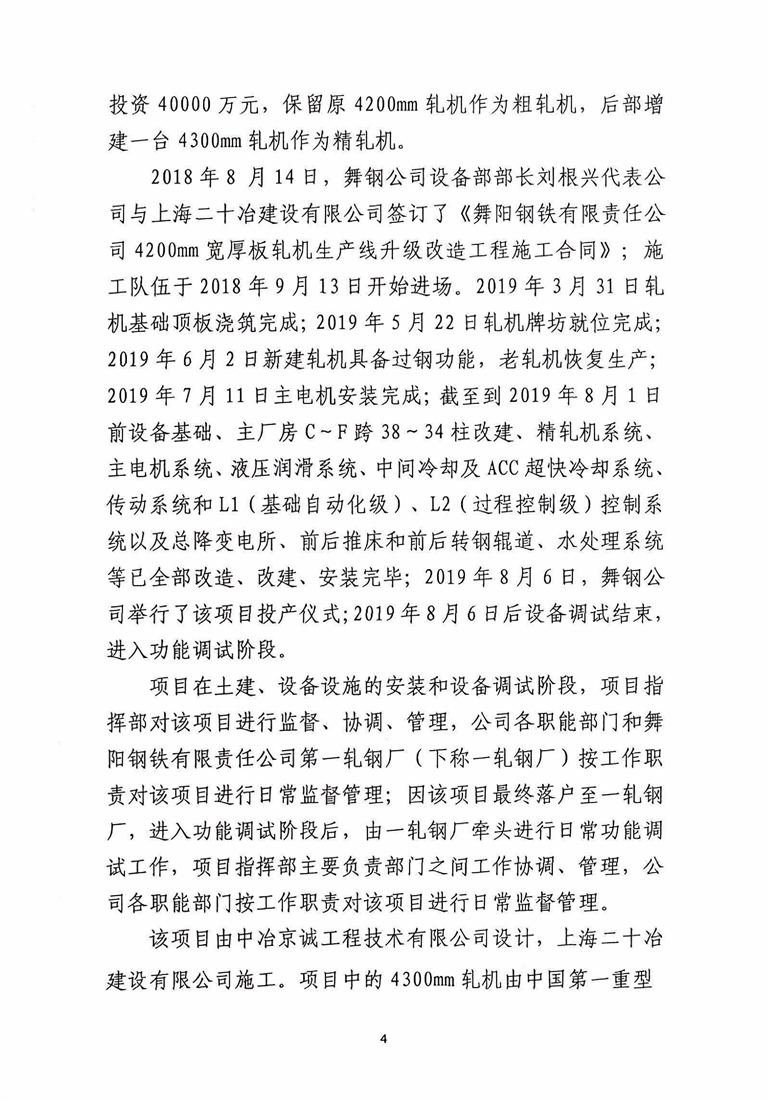 2018年8 月14日,舞鋼公司設備部部長劉根興代表公司與上海二十冶建設有限公司簽訂了《舞陽鋼鐵有限責任公司4200mm寬厚板軋機生產線升級改造工程施工合同》;施工隊伍于2018年9月13日開始進場。2019年3月31日軋機基礎頂板澆筑完成;2019年5月22日軋機牌坊就位完成;2019年6月2日新建軋機具備過鋼功能,老軋機恢復生產;2019年7月11日主電機安裝完成;截至到2019年8月1日前設備基礎、主廠房C~F跨38~34柱改建、精軋機系統、主電機系統、液壓潤滑系統、中間冷卻及ACC超快冷卻系統、傳動系統和L1(基礎自動化級)、L2(過程控制級)控制系統以及總降變電所、前后推床和前后轉鋼輥道、水處理系統等已全部改造、改建、安裝完畢;2019年8月6日,舞鋼公司舉行了該項目投產儀式;2019年8月6日后設備調試結束,進入功能調試階段。
