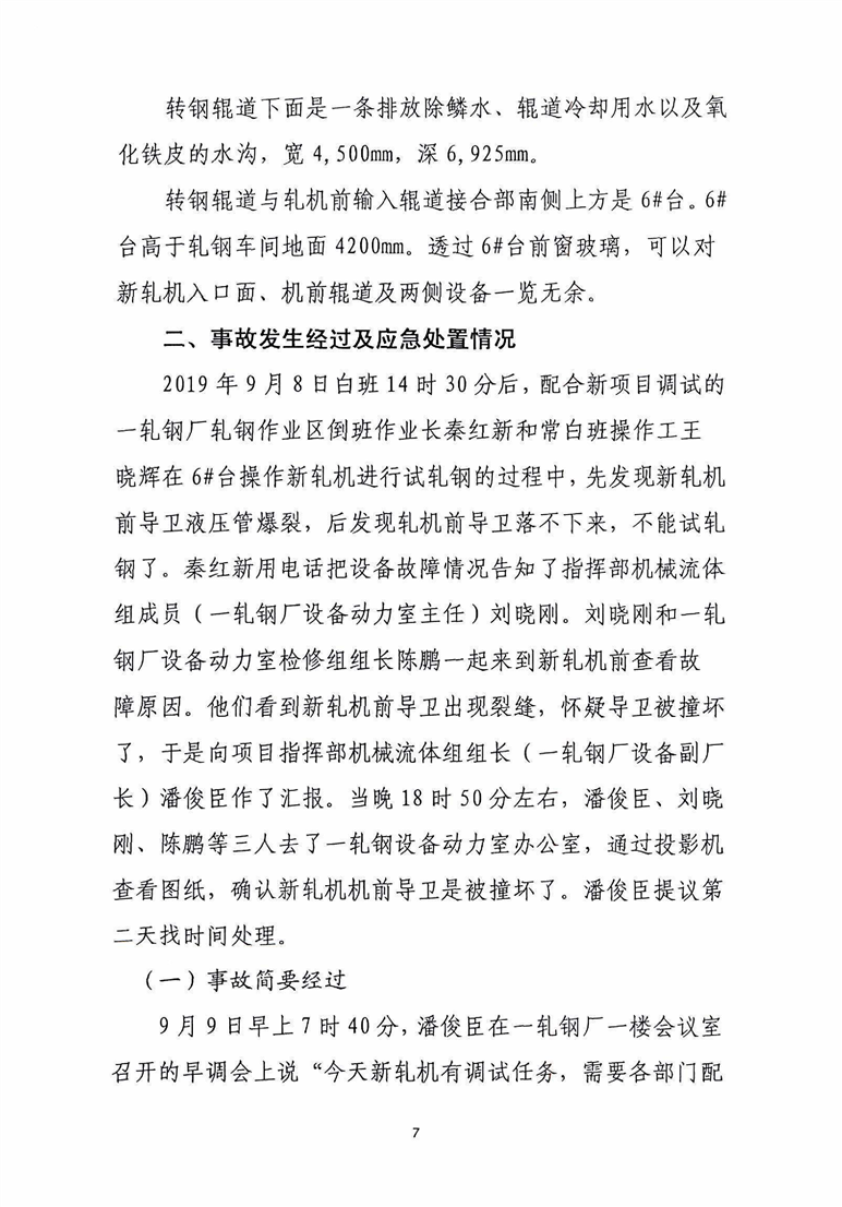 2019年9月8日白班14時30分后,配合新項目調試的一軋鋼廠軋鋼作業區倒班作業長秦紅新和常白班操作工王曉輝在6#臺操作新軋機進行試軋鋼的過程中,先發現新軋機前導衛液壓管爆裂,后發現軋機前導衛落不下來,不能試軋鋼了。秦紅新用電話把設備故障情況告知了指揮部機械流體組成員(一軋鋼廠設備動力室主任)劉曉剛。劉曉剛和一軋鋼廠設備動力室檢修組組長陳鵬一起來到新軋機前查看故障原因。他們看到新軋機前導衛出現裂縫,懷疑導衛被撞壞了,于是向項目指揮部機械流體組組長(一軋鋼廠設備副廠長)潘俊臣作了匯報。當晚18時50分左右,潘俊臣、劉曉剛、陳鵬等三人去了一軋鋼設備動力室辦公室,通過投影機查看圖紙,確認新軋機機前導衛是被撞壞了。潘俊臣提議第二天找時間處理。