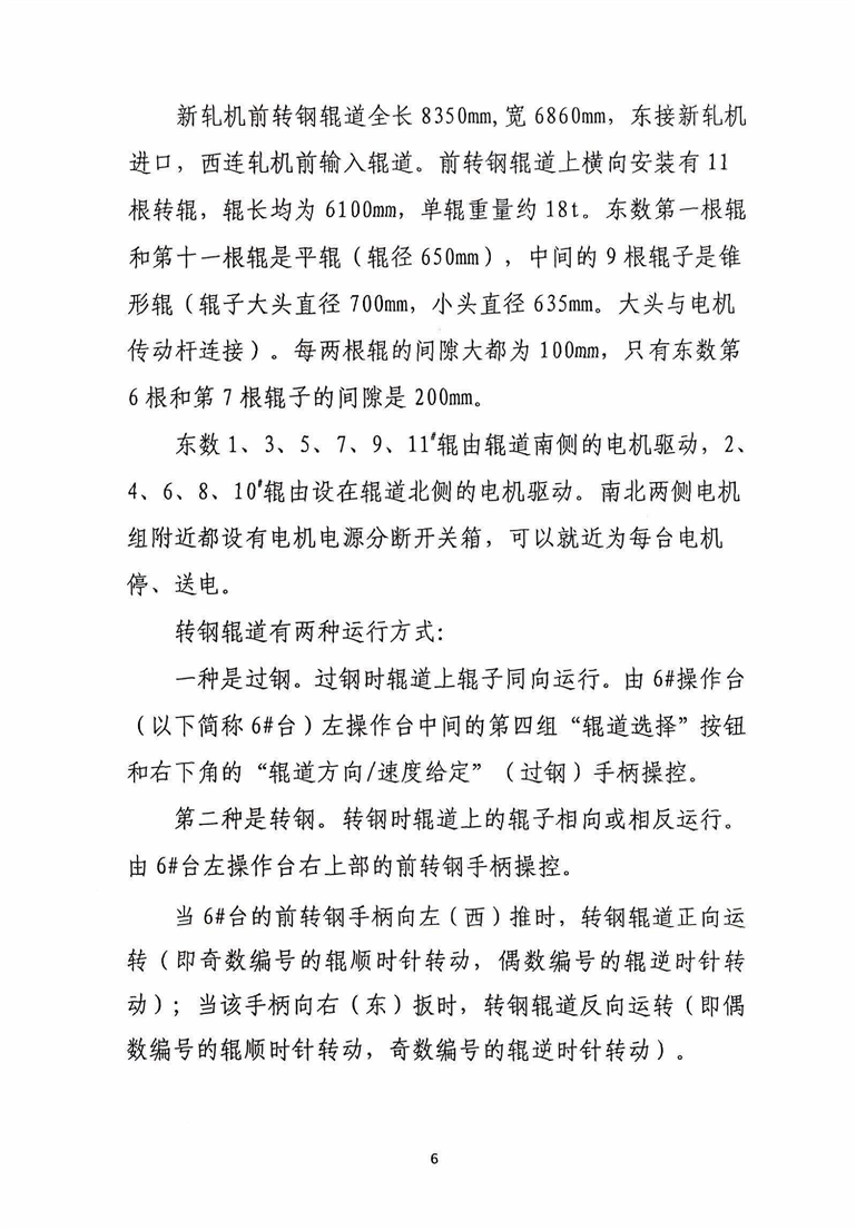 大概16時16分左右,電氣自動化作業區主管工程師安宏燦接到6#臺操作工王曉輝的電話,得知新軋機前轉鋼輥道擠住人了。安宏燦進行確認后,去新軋機ER1電氣室,對新軋機6#臺電氣系統進行停電。停電時間是16時20分左右。