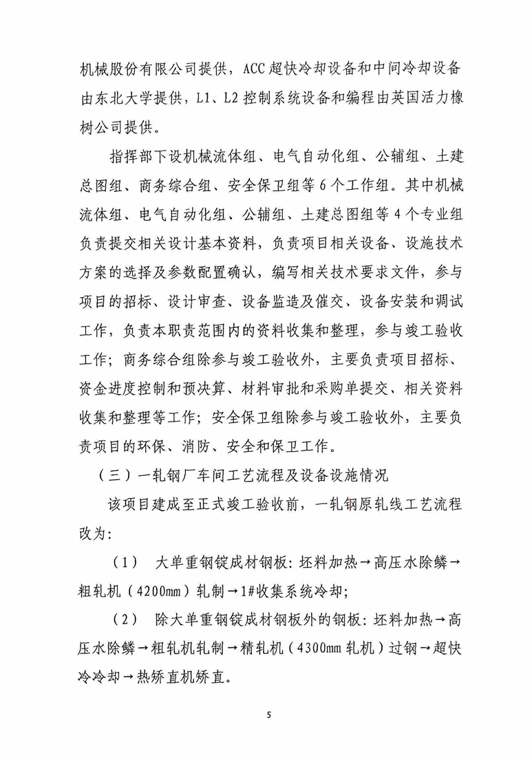 2018年4月15日,舞鋼公司為保證項目的順利進行,成立了4300mm寬厚板軋機生產線升級改造工程項目籌建指揮部(下稱項目指揮部)對該項目建設工作進行集中統一領導和協調管理。