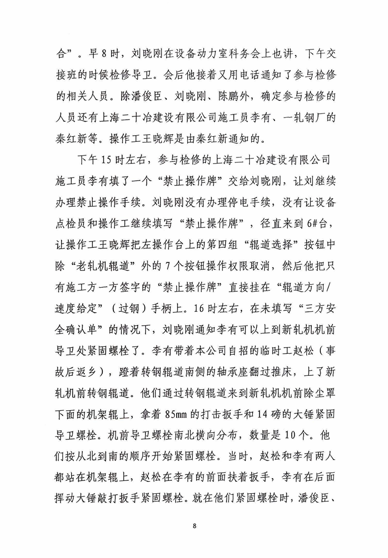 下午15時左右,參與檢修的上海二十冶建設有限公司施工員李有填了一個“禁止操作牌”交給劉曉剛,讓劉繼續辦理禁止操作手續。劉曉剛沒有辦理停電手續,沒有讓設備點檢員和操作工繼續填寫“禁止操作牌”,徑直來到6#臺,讓操作工王曉輝把左操作臺上的第四組“輥道選擇”按鈕中除“老軋機輥道”外的7個按鈕操作權限取消,然后他把只有施工方一方簽字的“禁止操作牌”直接掛在“輥道方向/速度給定”(過鋼)手柄上。16時左右,在未填寫“三方安全確認單”的情況下,劉曉剛通知李有可以上到新軋機機前導衛處緊固螺栓了。李有帶著本公司自招的臨時工趙松(事故后返鄉),蹬著轉鋼輥道南側的軸承座翻過推床,上了新軋機前轉鋼輥道。他們通過轉鋼輥道來到新軋機機前除塵罩下面的機架輥上,拿著85mm的打擊扳手和14磅的大錘緊固導衛螺栓。機前導衛螺栓南北橫向分布,數量是10個。他們按從北到南的順序開始緊固螺栓。當時,趙松和李有兩人都站在機架輥上,趙松在李有的前面扶著扳手,李有在后面揮動大錘敲打扳手緊固螺栓。就在他們緊固螺栓時,潘俊臣、秦紅新和劉曉剛為查看情況也上了輥道。同時,陳鵬也從輥道北側蹬著轉鋼輥道的軸承座上了輥道。他們在李有的身后觀察了一會兒,劉曉剛對李有說:“導衛導向鍵槽那兒還有縫,接著緊吧?!崩钣新犕旰?,回身繼續緊螺栓。大約又緊了一到兩個螺栓時(具體時間是16時13分),轉鋼輥道突然轉動,秦紅新、潘俊臣、劉曉剛以及被劉曉剛叫上來幫忙緊固螺栓的張東曉(舞鋼公司實業公司派來的勞務人員)幾乎同時被卷進了相向轉動的輥縫里。秦紅新、潘俊臣被夾在轉鋼輥道東數第一根和第二根輥子的輥縫里。秦紅新靠近北側,被輥縫夾到腰部;潘俊臣近南側,被輥縫夾到胸部。劉曉剛被夾在東數第三根和第四根輥靠近南側的輥縫里,被夾到腰部。被劉曉剛喊來幫忙的張東曉是從轉鋼輥道東南側上了輥道。正行進間,張東曉左腿被突然轉動的東數第七根和第八根輥子夾在靠近南側的輥縫里。當時陳鵬一只腳站在轉鋼輥道上,一只腳站在機架輥軸承座上看李有他們緊螺栓,不經意間被突然轉動的轉鋼輥道輥子帶倒了?;琶χ嘘慁i下意識的拉了一下正在前面緊固螺栓的二十冶施工人員趙松,才沒有被夾到輥縫里。