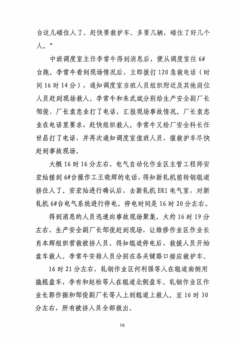 16時21分左右,軋鋼作業區何利強等人在輥道南側用撬棍盤車,李有和趙松等人在輥道北側盤車。軋鋼作業區作業長郭作振和鄒俊副廠長等人上到輥道上救人。至16時30分左右,所有被擠人員全部救出。