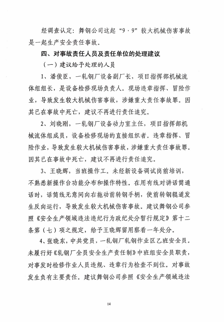 14、劉忠玉,舞鋼公司設備部設備科科長,負責設備科全面工作。未按公司“管業務必須管安全”的原則,監督好項目安全管理工作,安全生產管理不到位;未履行好舞鋼公司《設備部職責條例》中設備科的職責,對設備崗位人員技術交流、培訓工作管理不到位。對事故發生負有重要領導責任。建議舞鋼公司參照《安全生產領域違法違紀行為政紀處分暫行規定》第十二條第(七)項之規定,給予其記大過處分。