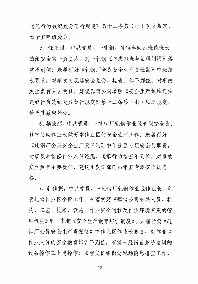 5、任亞強,中共黨員,一軋鋼廠軋鋼車間乙班值班長,班組安全第一負責人。對一軋鋼廠《隱患排查與治理制度》落實不到位;未履行好該廠《軋鋼廠全員安全生產責任制》中班組長職責,對事發時現場安全監督、檢查工作不到位。對事故發生負有主要責任。建議舞鋼公司參照《安全生產領域違法違紀行為政紀處分暫行規定》第十二條第(七)項之規定,給予其撤職處分。