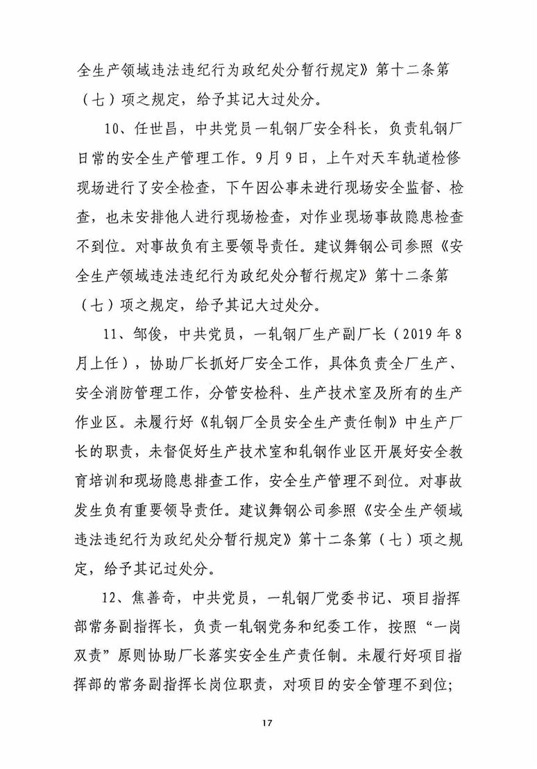12、焦善奇,中共黨員,一軋鋼廠黨委書記、項目指揮部常務副指揮長,負責一軋鋼黨務和紀委工作,按照“一崗雙責”原則協助廠長落實安全生產責任制。未履行好項目指揮部的常務副指揮長崗位職責,對項目的安全管理不到位;未履行好該廠《軋鋼廠全員安全生產責任制》中黨委書記的職責,未在日常生產期間協助廠長督促好一軋鋼廠管理人員做好安全教育培訓和現場隱患排查工作,安全生產管理不到位。對事故發生負有重要領導責任。建議舞鋼公司參照《安全生產領域違法違紀行為政紀處分暫行規定》第十二條第(七)項之規定,給予其記過處分。