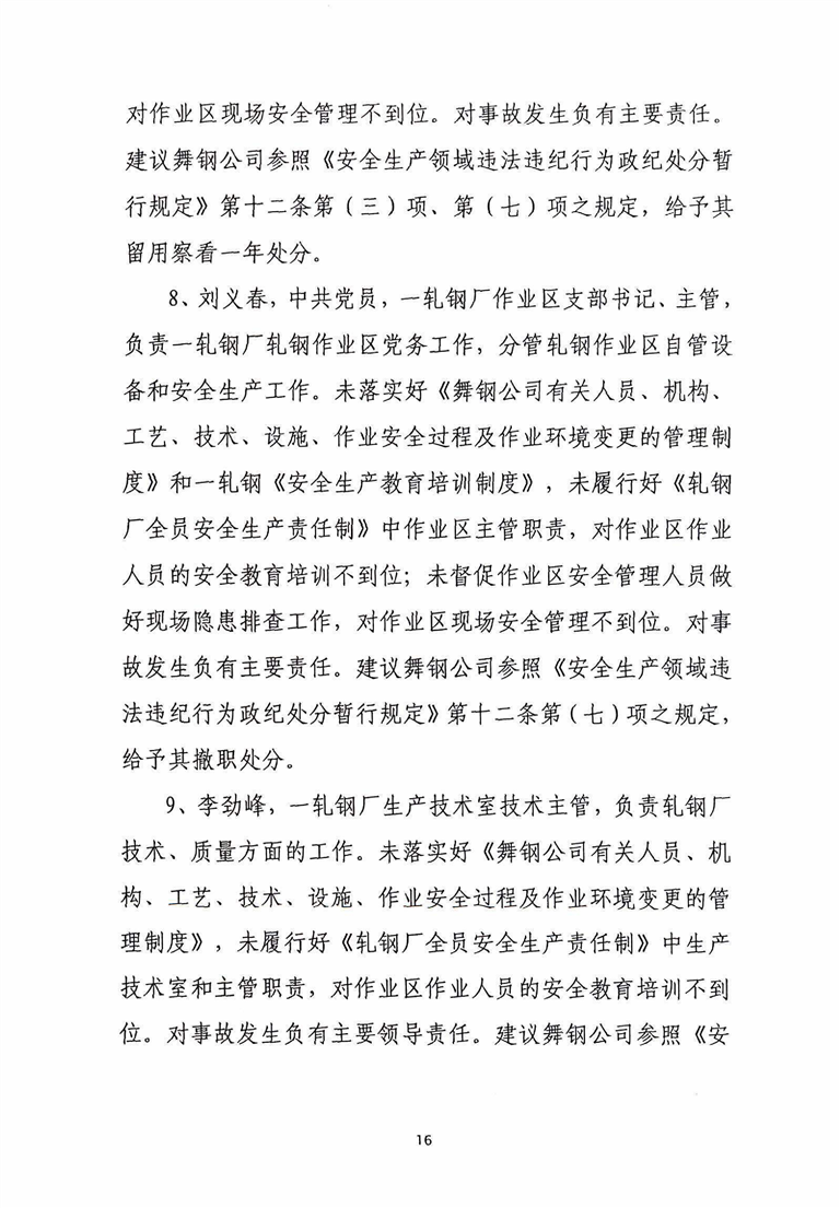 8、劉義春,中共黨員,一軋鋼廠作業區支部書記、主管,負責一軋鋼廠軋鋼作業區黨務工作,分管軋鋼作業區自管設備和安全生產工作。未落實好《舞鋼公司有關人員、機構、工藝、技術、設施、作業安全過程及作業環境變更的管理制度》和一軋鋼廠《安全生產教育培訓制度》,未履行好該廠《軋鋼廠全員安全生產責任制》中作業區主管職責,對作業區作業人員的安全教育培訓不到位;未督促作業區安全管理人員做好現場隱患排查工作,對作業區現場安全管理不到位。對事故發生負有主要責任。建議舞鋼公司參照《安全生產領域違法違紀行為政紀處分暫行規定》第十二條第(七)項之規定,給予其撤職處分。
