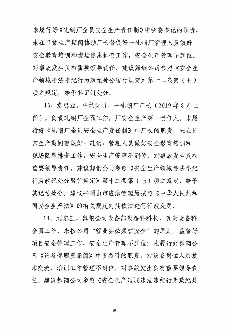 13、袁忠業,中共黨員,一軋鋼廠廠長(2019年8月上任),負責軋鋼廠全面工作,廠安全生產第一責任人。未履行好該廠《軋鋼廠全員安全生產責任制》中廠長的職責,未在日常生產期間督促好一軋鋼廠管理人員做好安全教育培訓和現場隱患排查工作,安全生產管理不到位。對事故發生負有重要領導責任。建議舞鋼公司參照《安全生產領域違法違紀行為政紀處分暫行規定》第十二條第(七)項之規定,給予其記過處分。建議平頂山市應急管理局按照《中華人民共和國安全生產法》的有關規定對其依法進行行政處罰。