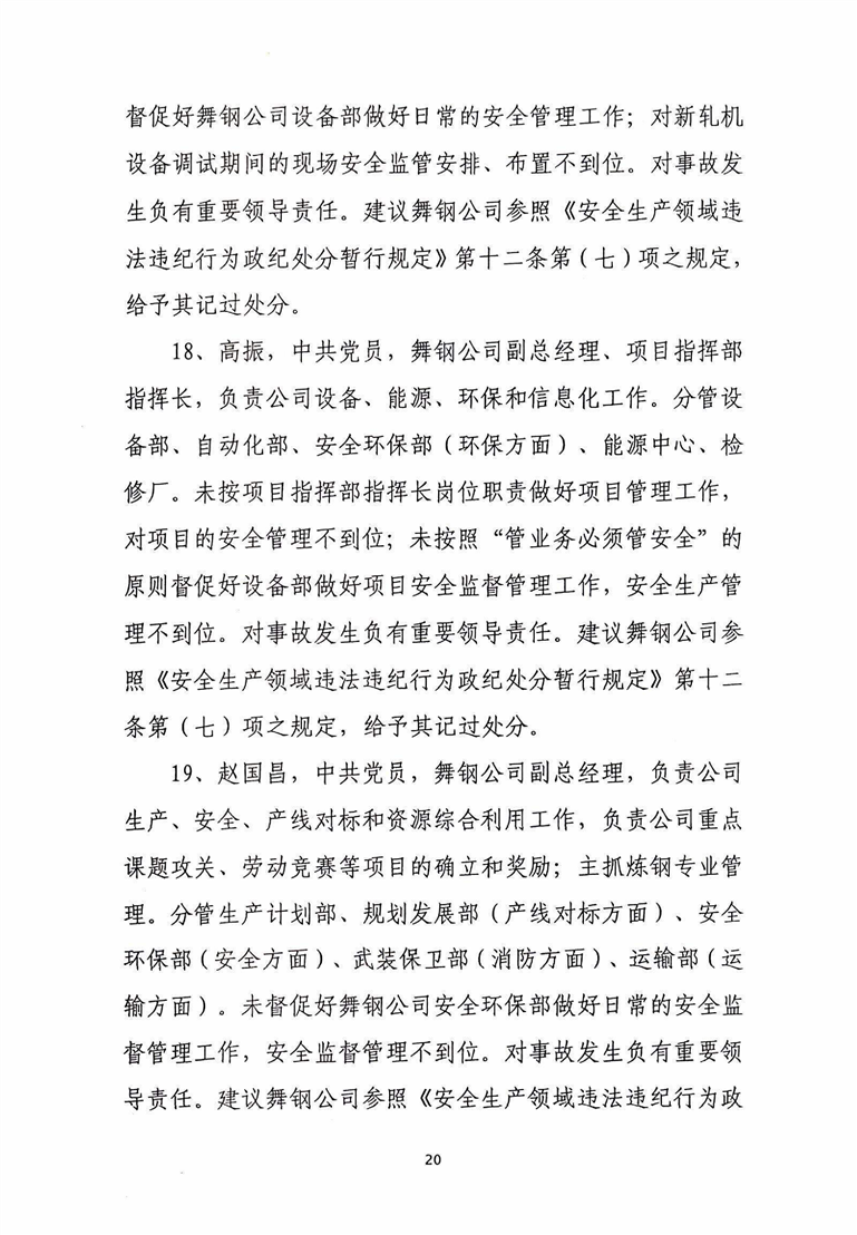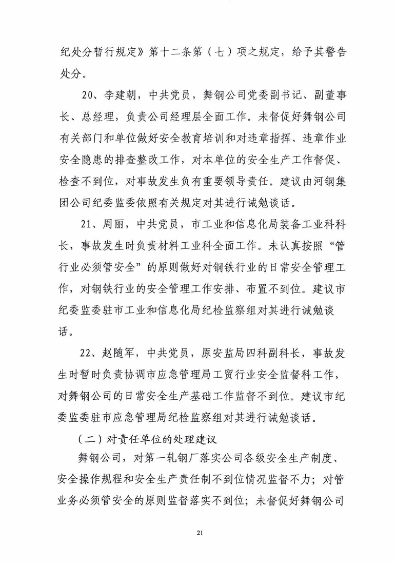20、李建朝,中共黨員,舞鋼公司黨委副書記、副董事長、總經理,負責公司經理層全面工作。未督促好舞鋼公司有關部門和單位做好安全教育培訓和對違章指揮、違章作業安全隱患的排查整改工作,對本單位的安全生產工作督促、檢查不到位,對事故發生負有重要領導責任。建議由河鋼集團公司紀委監委依照有關規定對其進行誡勉談話。