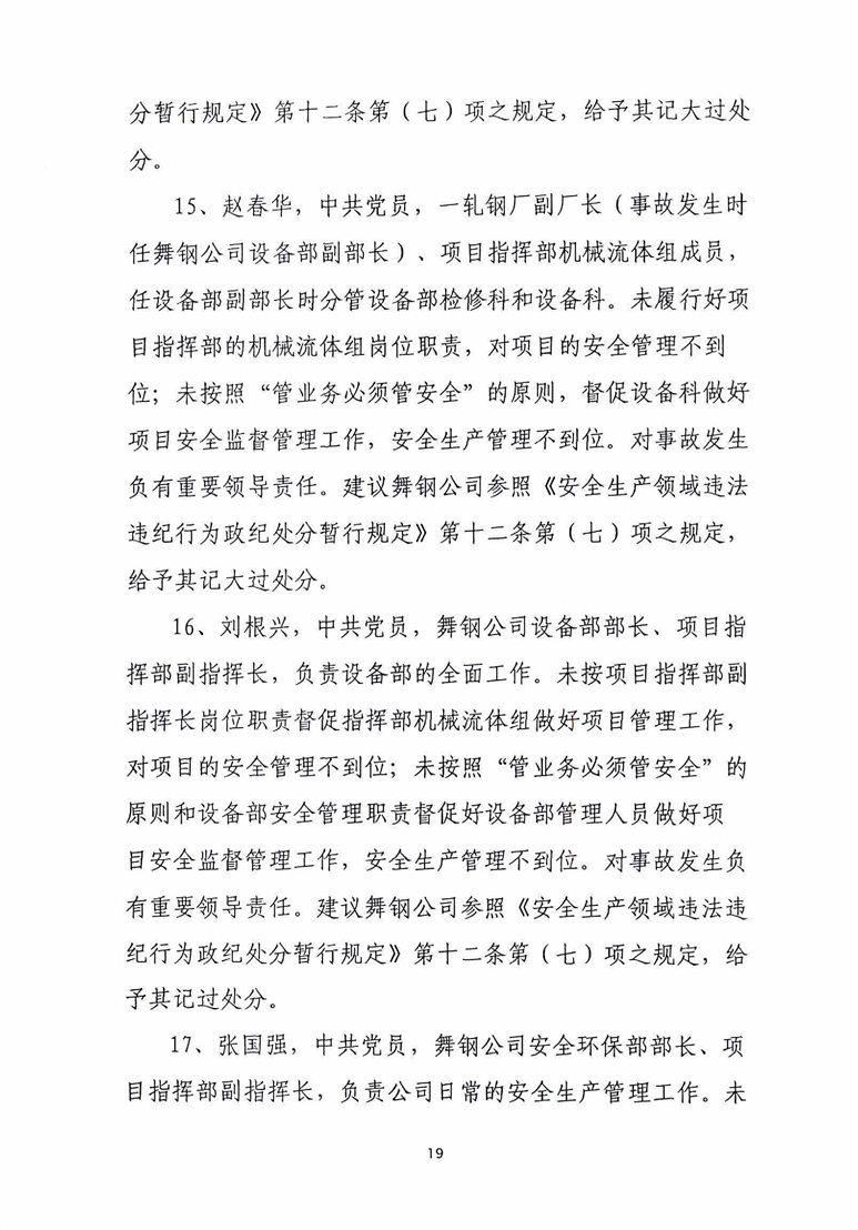 15、趙春華,中共黨員,一軋鋼廠副廠長(事故發生時任舞鋼公司設備部副部長)、項目指揮部機械流體組成員,任設備部副部長時分管設備部檢修科和設備科。未履行好項目指揮部的機械流體組崗位職責,對項目的安全管理不到位;未按照“管業務必須管安全”的原則,督促設備科做好項目安全監督管理工作,安全生產管理不到位。對事故發生負有重要領導責任。建議舞鋼公司參照《安全生產領域違法違紀行為政紀處分暫行規定》第十二條第(七)項之規定,給予其記大過處分。
