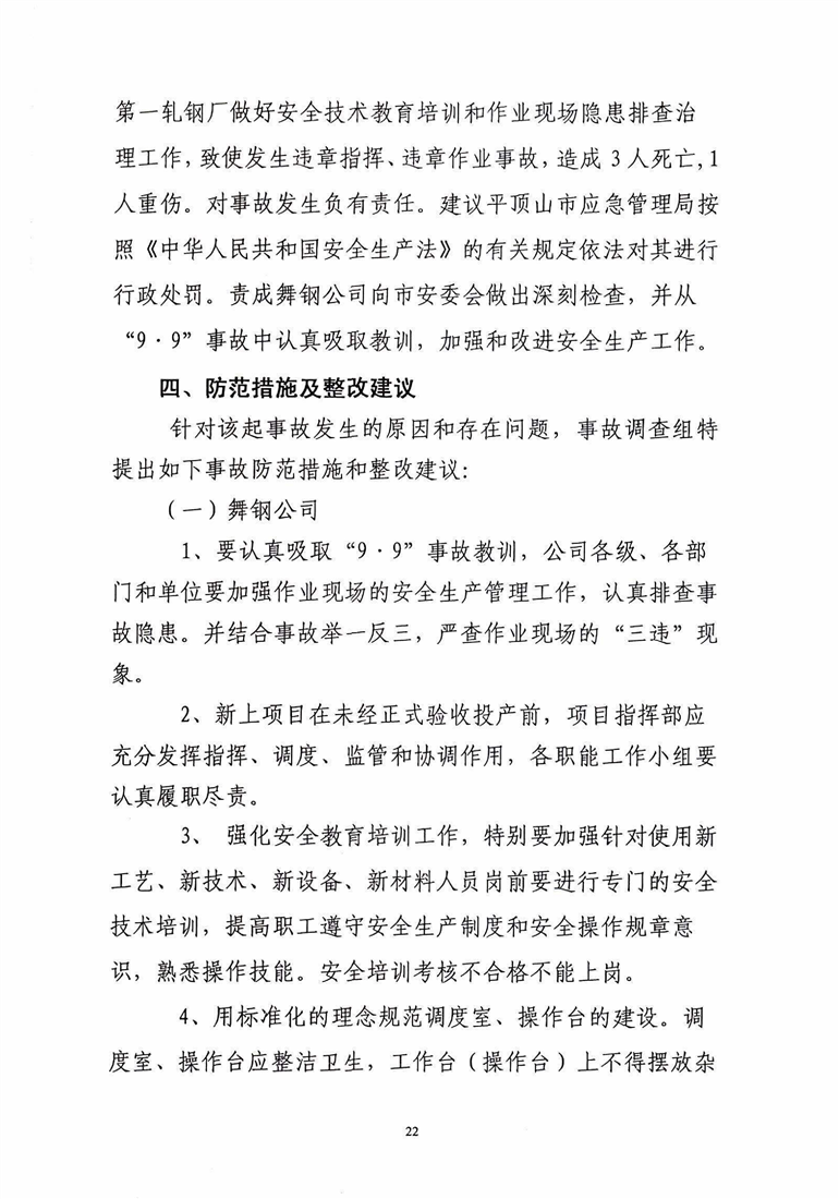 舞鋼公司,對第一軋鋼廠落實公司各級安全生產制度、安全操作規程和安全生產責任制不到位情況監督不力;對管業務必須管安全的原則監督落實不到位;未督促好舞鋼公司第一軋鋼廠做好安全技術教育培訓和作業現場隱患排查治理工作,致使發生違章指揮、違章作業事故,造成3人死亡,1人重傷。對事故發生負有責任。建議平頂山市應急管理局按照《中華人民共和國安全生產法》的有關規定依法對其進行行政處罰。責成舞鋼公司向市安委會做出深刻檢查,并從“9·9”事故中認真吸取教訓,加強和改進安全生產工作。