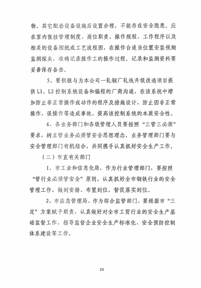 1、市工業和信息化局,作為行業管理部門,要按照“管行業必須管安全”原則,認真抓好全市鋼鐵行業的安全管理工作,做到安排、布置到位,督促落實到位。