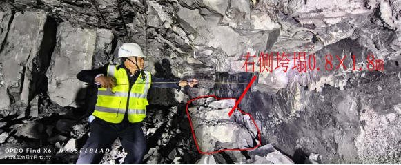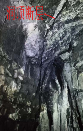 2024年11月7日專家組再次進入隧洞勘察,針對隧洞圍巖類別及穩定性進一步勘察。距掌子面3—4m附近發現一斜交穿越洞室的一小斷層,斷層左側產狀310°∠82°,斷層寬0.8m;頂部斷層寬1.20m;右側斷層扭轉,產狀為130°∠76°,斷層寬0.50m,右側斷層帶壓碎呈糜棱狀,成分為粉砂質泥巖手捻即碎(見照片7、8、9)。洞室右側洞腳下發育2組節理;①層面節理產狀為180°∠88°,②節理產狀為10°∠10°(緩傾角),兩兩切割,巖體破碎,在停工期間右側拱腳冒落巖體寬0.8m,長1.8m(見照片11);洞室左側頂部有少量巖塊掉落(見照片10)。從掌子面起裸露未支護洞段長5m,事故發生后26天內在裂隙及斷層發育部位發生間斷性巖塊掉落,面積約占1/5。