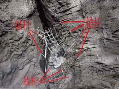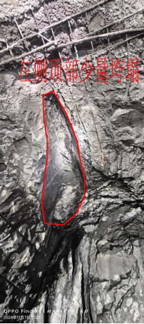事故段地質構造變化大,有斜向穿越洞室的小斷層,斷層帶呈糜棱狀,手捻即碎,局部夾薄層粉砂質泥巖軟弱夾層,巖體節理裂隙發育,且結構面具隱蔽性,采用傳統地質雷達超前預報及現場編錄難以分辨出被節理裂隙完全切割的危巖體,危巖體周圍已施工錨桿并增加了隨機錨桿加固,由于危巖體裂隙發育,錨固效果不理想,危巖體在爆破震動裂隙滲水軟化及自重的作用下產生冒頂。
