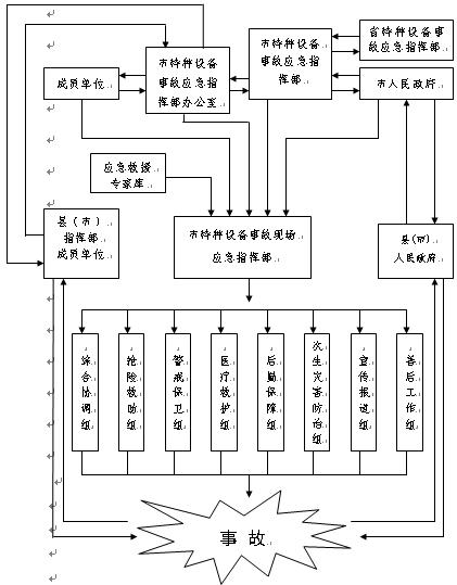 發(fā)生較大以上特種設(shè)備事故時,成立市特種設(shè)備事故現(xiàn)場應(yīng)急指揮部,負責事故現(xiàn)場應(yīng)急救援的指揮工作。指揮部下設(shè)若干應(yīng)急處置組,具體負責相關(guān)工作。