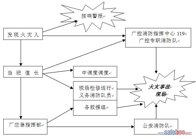 4.1.1 報警——發現火災人員要立即撥打廠內“119”或”8955”火警電話,向消防指揮中心報警,同時報當班值長,廠內電話“8205”。報警人員首先要向接警人講清楚火災的詳細地點和準確部位,燃燒物資及火勢大小。然后在安全區域等待專職消防隊。