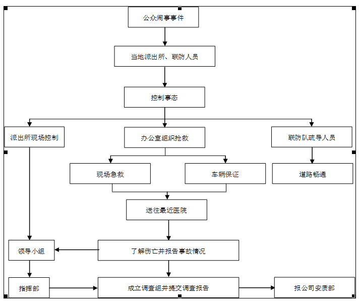 2 Ⅱ級(jí)響應(yīng):發(fā)生重大突發(fā)事件,應(yīng)急領(lǐng)導(dǎo)小組副組長(zhǎng)以及成員單位立即到現(xiàn)場(chǎng)處置,半小時(shí)內(nèi)將情況上報(bào)公司、****公安局。