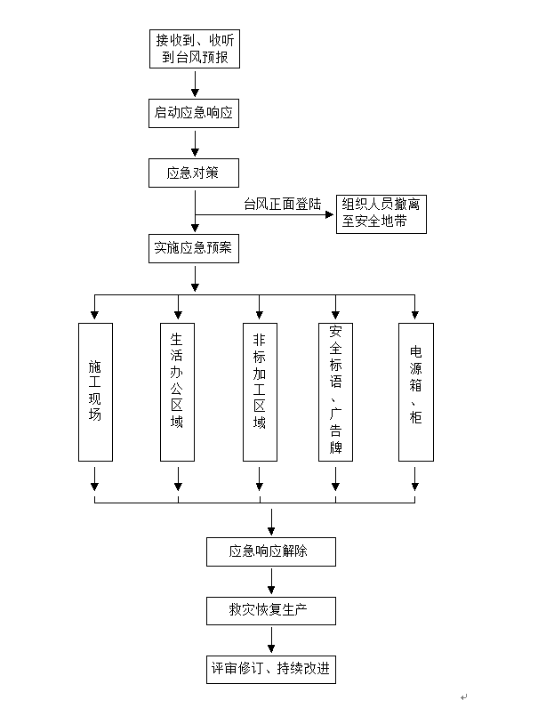 ·在臺風(fēng)來臨12小時內(nèi),全工地進(jìn)入防臺風(fēng)狀態(tài),防臺防汛辦公室開始值班,并負(fù)責(zé)及時了解臺風(fēng)的動向,防臺防汛領(lǐng)導(dǎo)小組進(jìn)入工作狀態(tài),搶險組進(jìn)入待命狀態(tài)。
