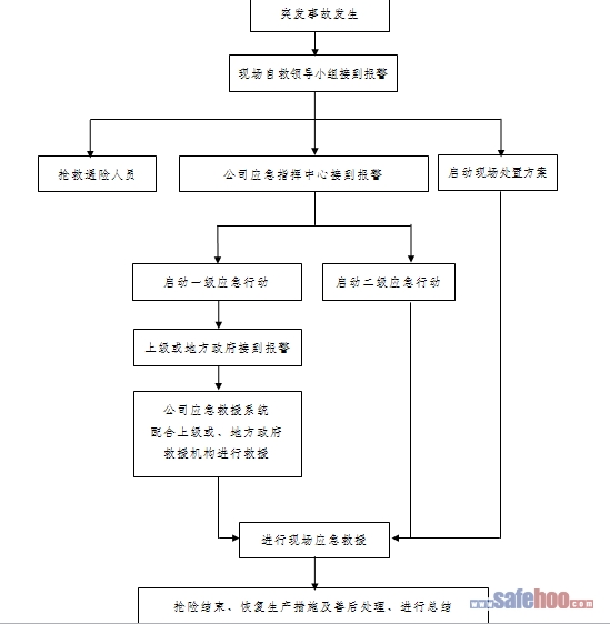 4.1.3當事故有擴大趨勢時,應急自救組長向公司應急救援指揮中心申請啟動應急預案,及時與地方政府、應急救援隊伍、公安、消防、醫(yī)院等相關(guān)部門取得聯(lián)系,確保24小時聯(lián)絡暢通,聯(lián)絡方式采用電話、傳真、電子郵件等。