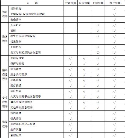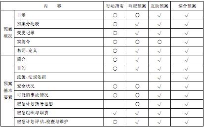 上述4種類型預案具體要求的程序文件如表1-1所示(表中標“√”項為該計劃包含內容,標“O”項為可選內容)。