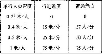 掌握若于情況下人員全部疏散所需要的時間.能夠更有效地開展疏散工作.疏散時間決定于疏散速度:疏散速度包括門口排放速度和走道中人的行走速度。它與人員密度。門的個數、寬度,走道的寬度。走道平坦程度(斜坡大小、是否有臺階)等因素有關。疏散時間應以在場顧客多少不同而分成不同的若干值、不同數量顧客的疏散時間可通過統計或計算得出.其中走道上人員的疏散時間可參考下表: