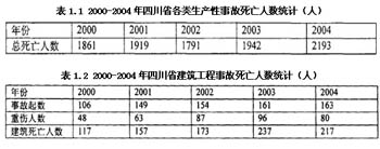 從世界范圍來看,一般而言,建筑工人比一般行業工人在現場受傷的概率高1倍,而死亡的概率則更是高達2至3倍。事故的頻繁發生,對社會生活和經濟發展產生了巨大的負面影響,同時也阻礙了建筑業的發展。根據美國2003年的一項研究,建筑業事故造成的經濟損失占到其總成本的7.9%一15%。而在我國,以四川省為例,2000-2004年四川省各類生產行業發生死亡事故人數分別為2000年的1861人到2004年的2193人不等(見表1.1)。其中,由于建筑施工造成的年均死亡人數為180人,占總死亡人數的10%(見表1.2)。