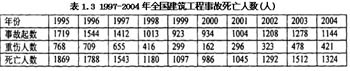 從全國傷亡事故統計資料分析,截至2005年全國歷年發生的建筑施工傷亡事故見表1.3。就整體現狀看,我國的建筑事故傷亡比例水平很高。
