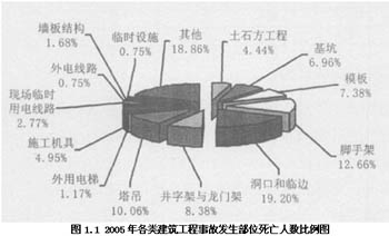 從事故易發部位來看,高處作業是事故產生的重要根源,臨邊洞口的建筑施工傷亡事故率明顯較高。以2005年數據為例,在臨邊洞口處作業發生的事故死亡人數占到19.20%;其他高處作業類型如腳手架上作業,占12.66%,安裝、拆除龍門架(井字架)物料提升機過程中產生事故,占8.38%;在安裝、拆除塔吊過程中產生事故的,占10.06%。除此之外的其他事故易發部位還有:基坑部位,由于基坑挖掘事故導致的死亡人數比例為6.96%;土石方施工部位,由于土石方坍塌事故導致的死亡人數比例為4.44%;與施工機械和機具混合作業部位,由于施工機具造成的事故死亡人數比例為4.95%;另外,還有因模板支撐失穩倒塌事故導致死亡人數比例為7.38%;外電線路死亡人數比例為0.75%;現場臨時用電線路死亡人數比例為2.77%(見圖1.1)。