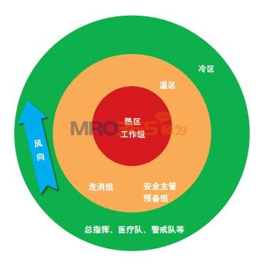 應急搶險作業之初應當首先確定危險的種類,位置,為進一步的搶險作業采集必要的信息。然后根據這些信息劃分區域,通常根據事故的類型、設計的危害及特點、危險的程度及作業的特點分為熱區、溫區和冷區(如圖所示),然后根據作業特點為各個區域的人員配備合適的設備,各個區域內的人員和各區域的不同小組之間要進行配合作業。