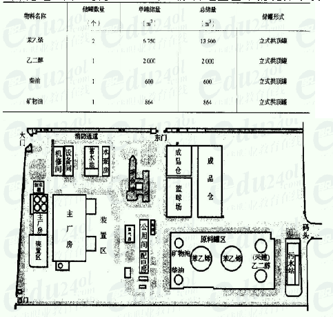 某聚苯樹脂的廠區(qū)布置如圖所示。廠區(qū)占地面積64 292m2,建筑面積35 514 m2,周邊縱向距離為400 m,橫向距離180 m。廠區(qū)主要建筑為12層綜合樓、3層主生產車間和2座輔助車間,另有機修、倉庫等設施。生產裝置區(qū)建有3條聚苯乙烯生產線(1#、2#、3#生產線),并有日用罐區(qū)(乙苯儲罐1個,80 ml;苯乙烯儲罐2個,均為5815 m3)。原料罐區(qū)基本情況如下表。